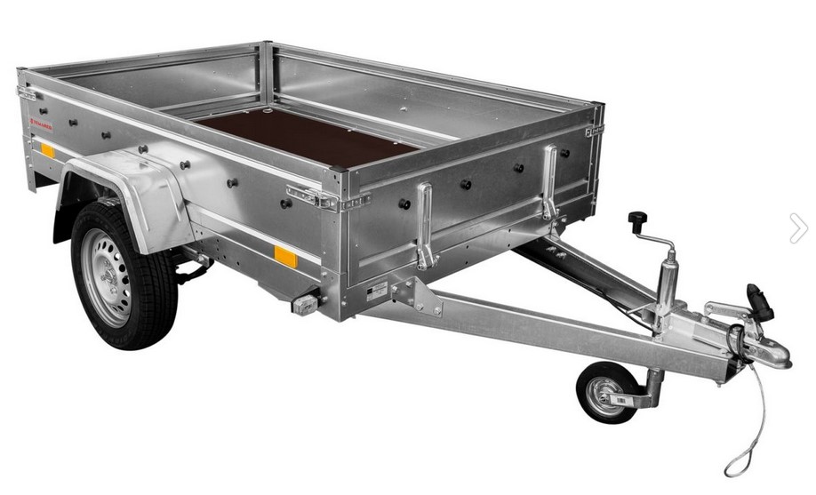 Rimorchio auto con sospensione a balestra da 750Kg. Tara 178Kg, portata utile 572Kg. Pianale 205×125 cm.
