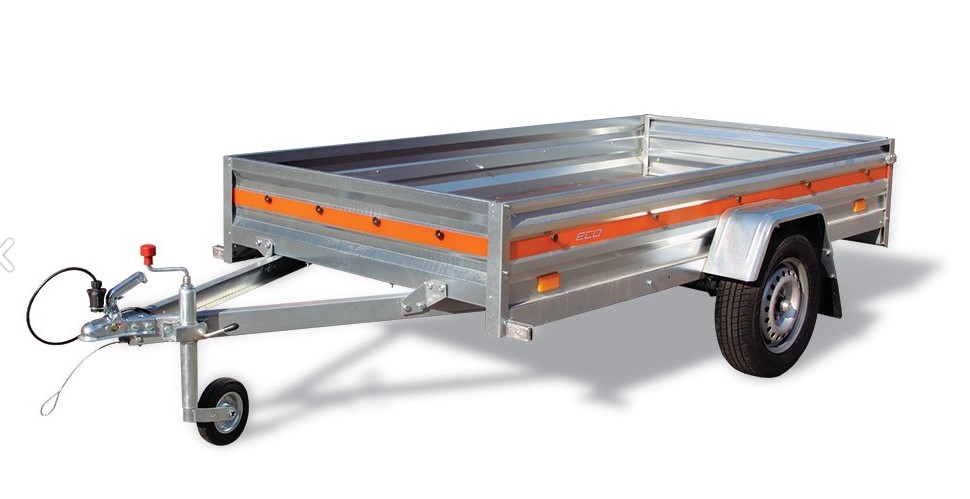 Carrello per auto rimorchio porta cose da 750Kg massa complessiva. Tara 146Kg, portata utile 604Kg. Modello Temared Eco 2612. Altezza delle sponde 320 mm, sponda posteriore apribile, timone a V, pianale in compensato fenolico antiscivolo spessore 9 mm, ruotino.